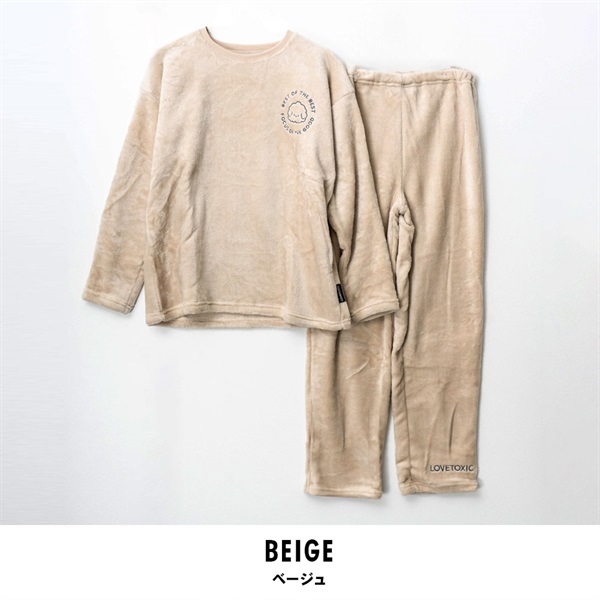 まるでぬいぐるみみたいなふわもこな肌触り♪Lovetoxic(ラブトキシック)のパジャマセットです。軽くてあたたかい素材感で、寒い季節のおうち時間をやさしく包み込みます。胸元のワンポイント刺繍ロゴがさりげなく可愛く、ガーリーな雰囲気に。ゆったりとしたシルエットで動きやすく、おやすみタイムもリラックスタイムも快適に過ごせます。