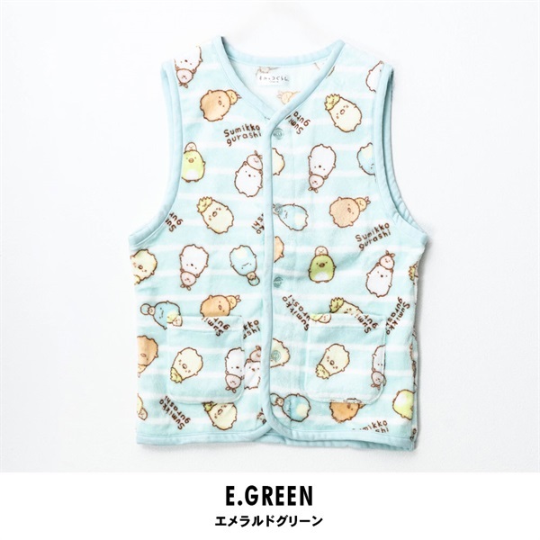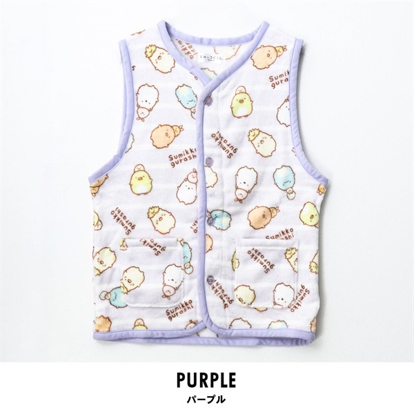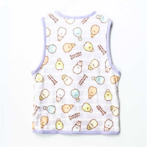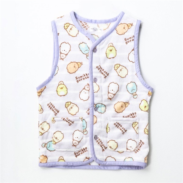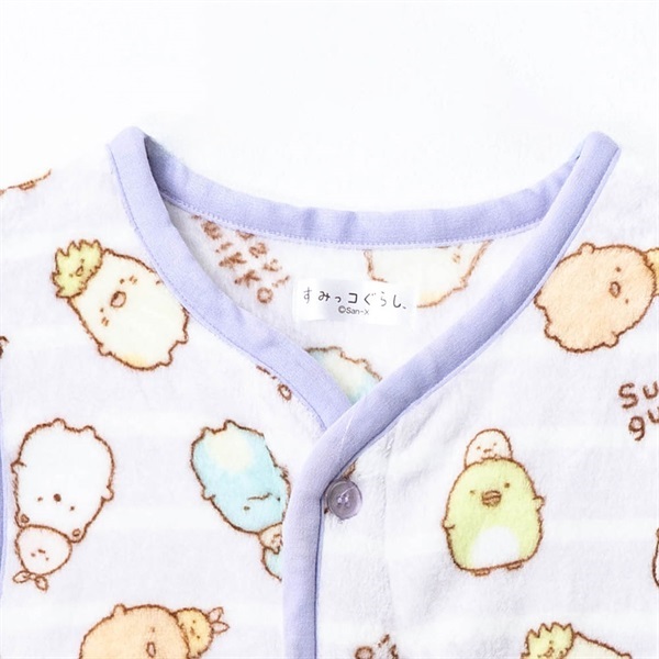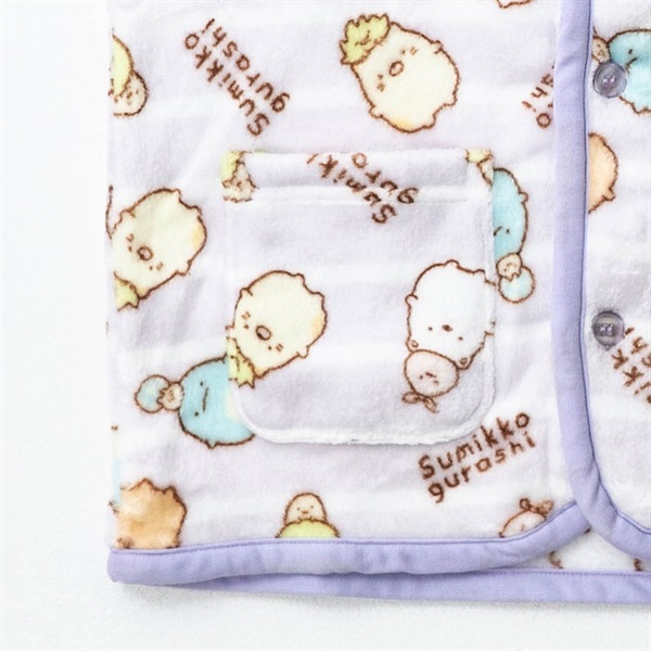 しろくま・ぺんぎん?・ねこ・とんかつなどおなじみのすみっコぐらしのキャラクターが総柄でデザインされた、とってもキュートな1枚です。あたたかい素材で、冷えが気になる朝晩やリラックスタイムにぴったり。パジャマの上や普段着の上から羽織るだけで、ぬくぬくあたたかいお部屋スタイルに。