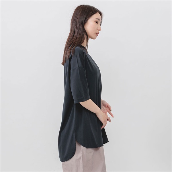 さらっとした肌ざわりで夏場も快適に過ごせます。着丈に前後差をつけたらラウンドヘムデザインでシンプルながらもこなれた感たっぷりに着こなせます。