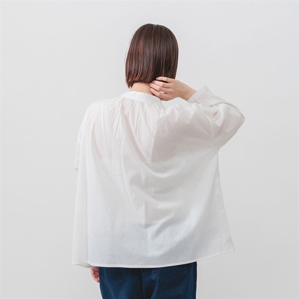 前開きデザインで羽織りとしても着用でき、冷房対策や日除けにも重宝します。袖口や衿ぐりのギャザーがやわらかな表情を添え、上品で女性らしい印象に。ナチュラル感と機能性を両立した、大人のためのブラウスです。