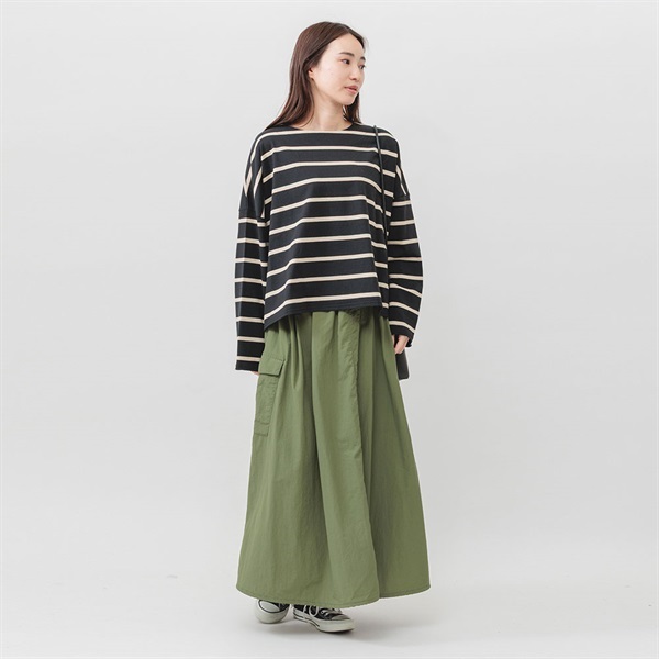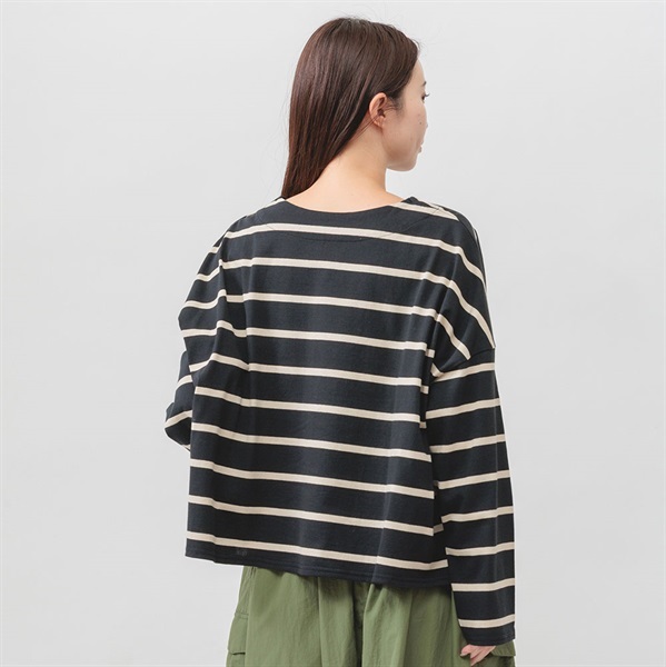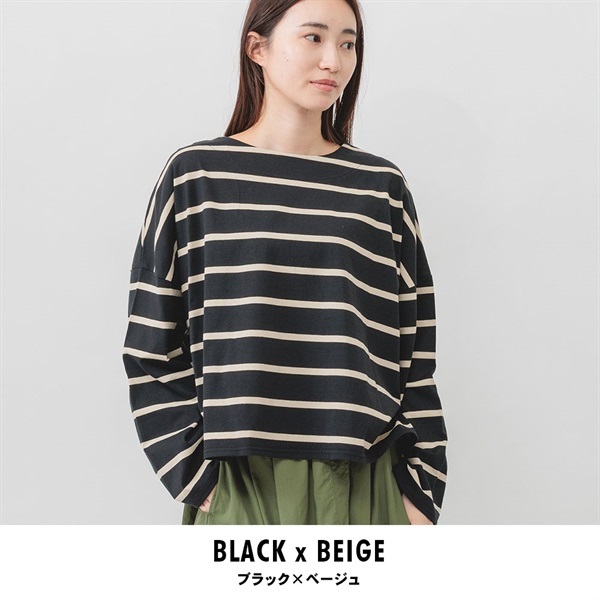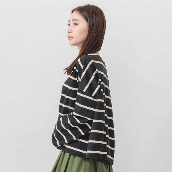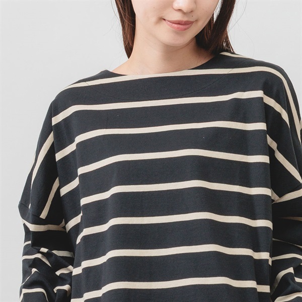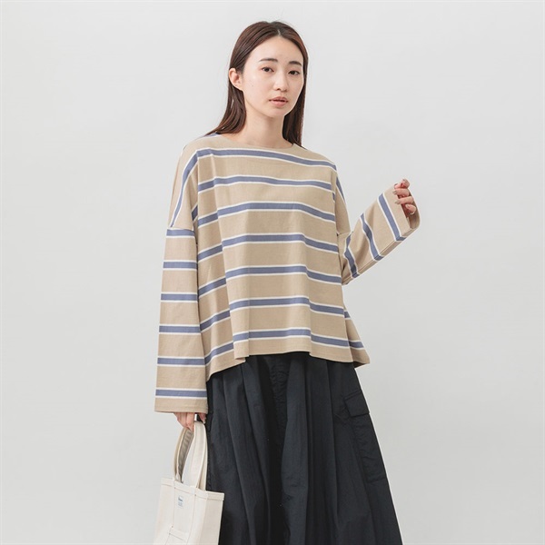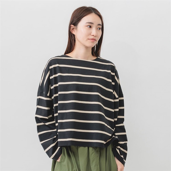 ワイドボーダーが程よくカジュアルな印象を添えつつ、広すぎない首元の開きや、ゆったりとした身幅とコンパクトな丈のバランスで、すっきりとしたシルエットに。気負わず着られて、どこか品のある一枚。日々の装いに自然となじむ、頼れるアイテムです。