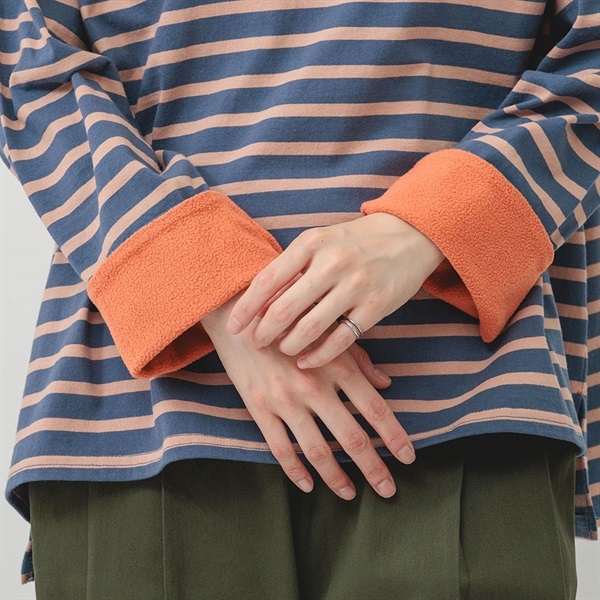 身生地は柔らかく肌に馴染む綿天竺素材を使用しております。見返しと袖口にフリースを使用しており、暖かさとワンポイントを兼ね備えたアイテムです。両脇には、スリットが入っており、こなれ感を演出してくれます。