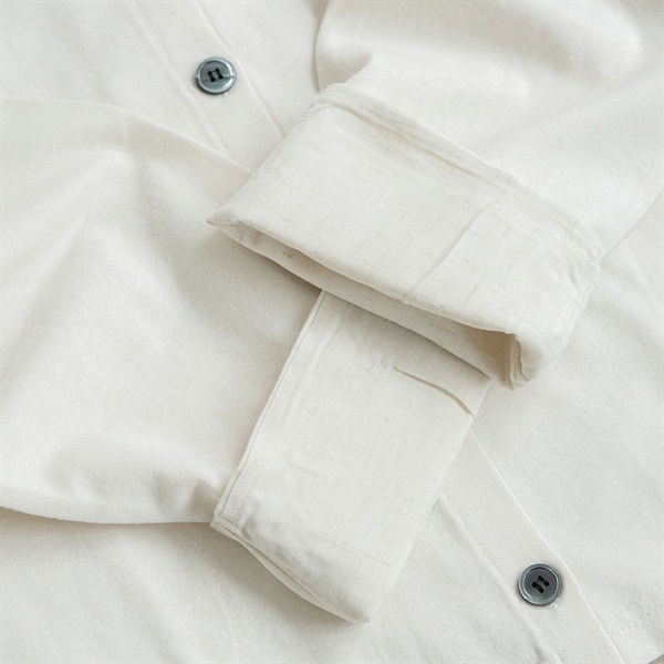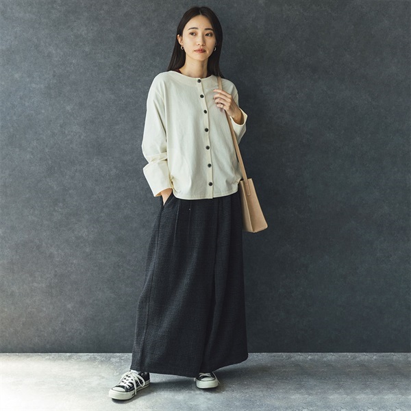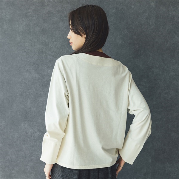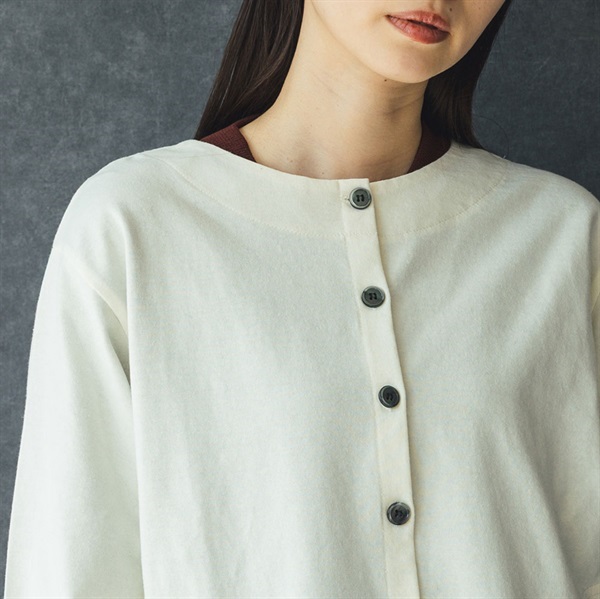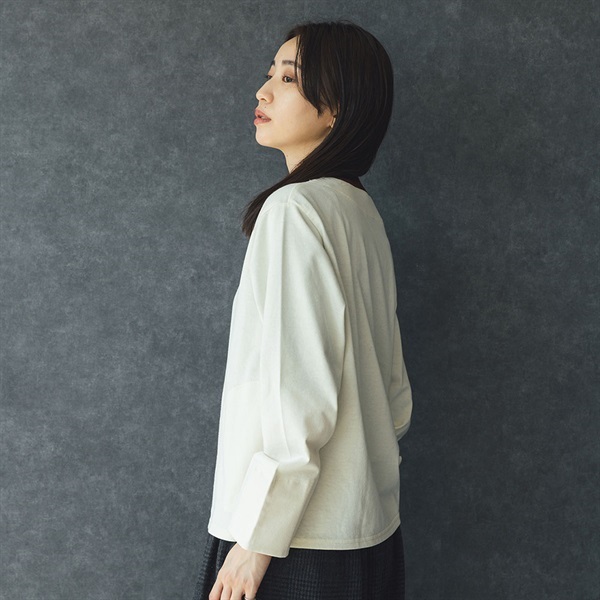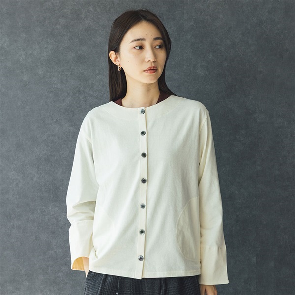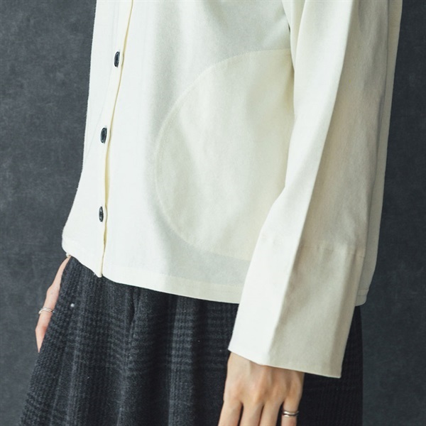 しっかりとした風合いながらも、軽やかで気負わず羽織れる一枚です。黒蝶貝釦がさりげないポイントに。ネックや袖口の見返しにはナチュラルな布帛生地を使い、自然な表情に。両サイドにはポケット付きで、日常使いにちょうどいいカーディガンです。