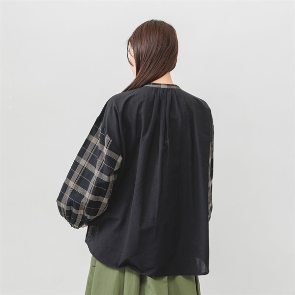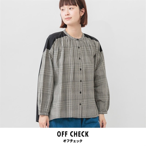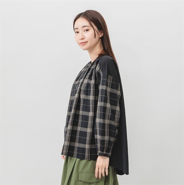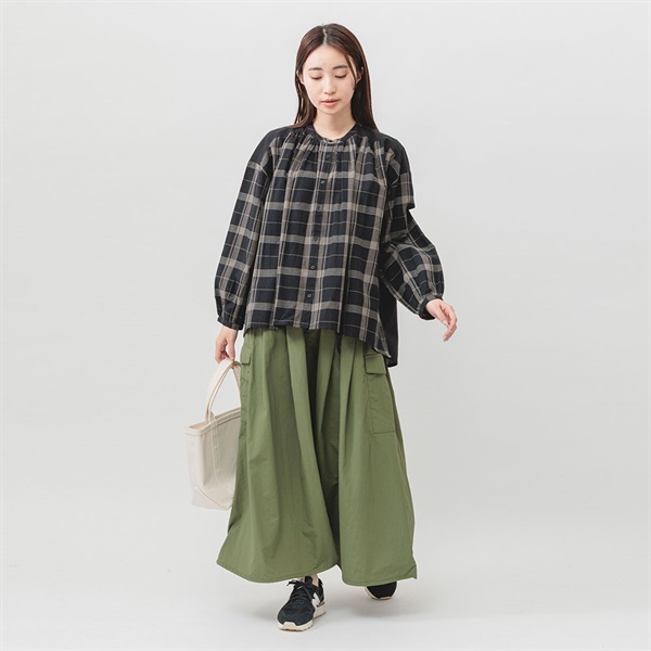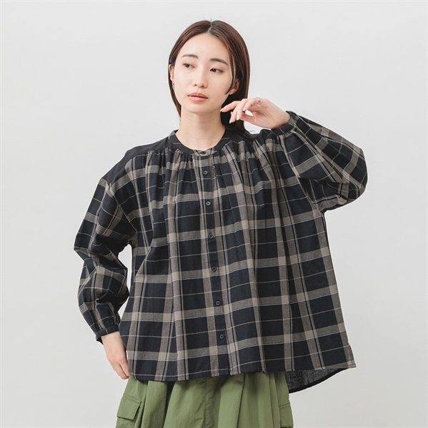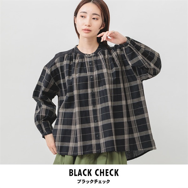 落ち着いた色展開のチェックで、コーディネートに取り入れやすく、汎用性抜群です。顔まわりのギャザーが華やかな印象をプラスします。