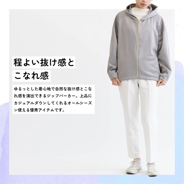 ゆるっとした着心地で自然な抜け感とこなれ感を演出できるジップパーカー。上品にカジュアルダウンしてくれるオールシーズン使える優秀アイテムです。