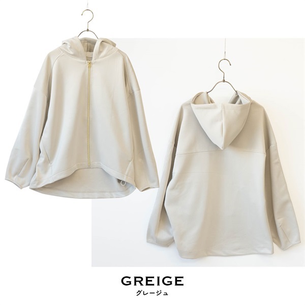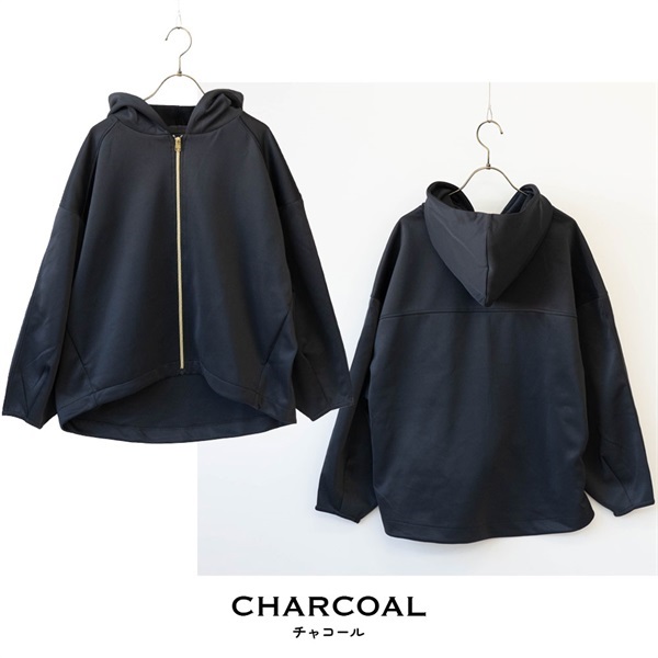 程よく薄手の若干光沢のある生地感で軽い着心地を実現。ふっくらとしたボリュームのあるフードが小顔効果にも一役。ゆったり長めのシルエットで体型を隠してお洒落に着こなせます。サイドポケットあり。