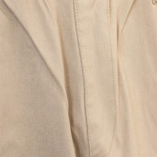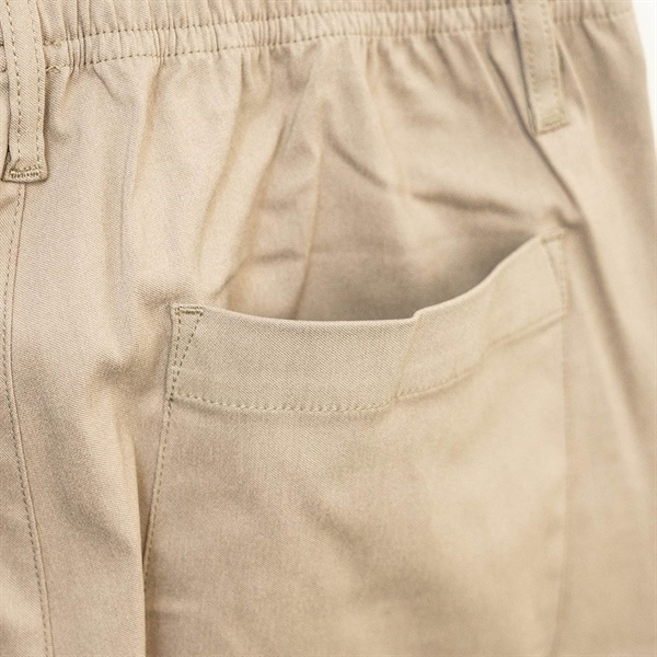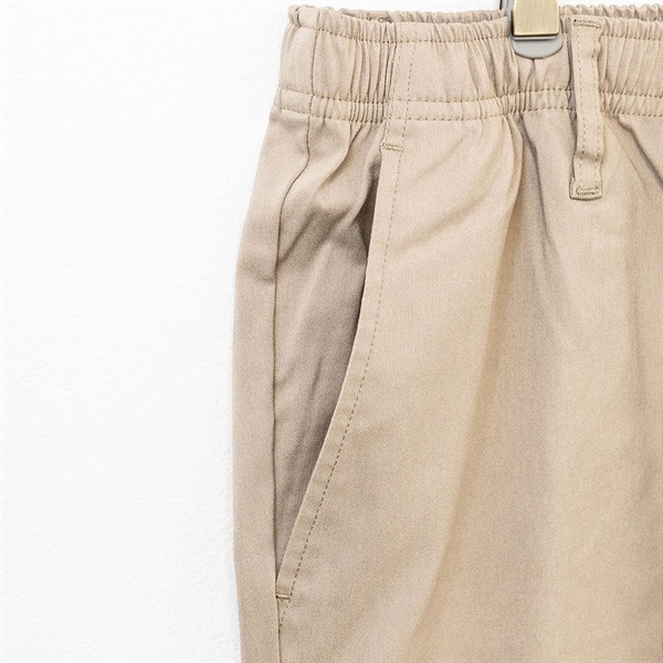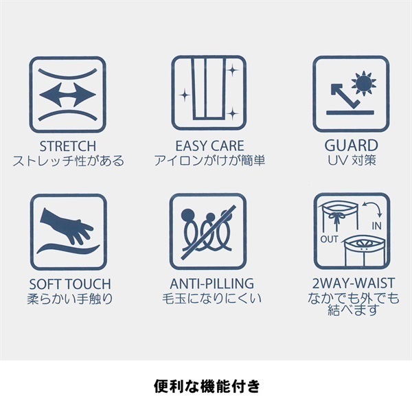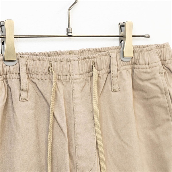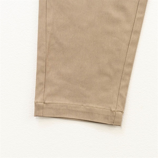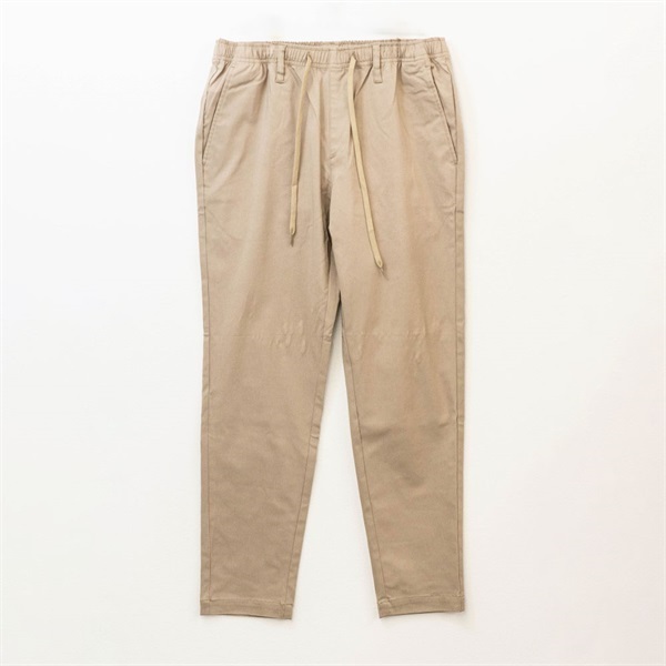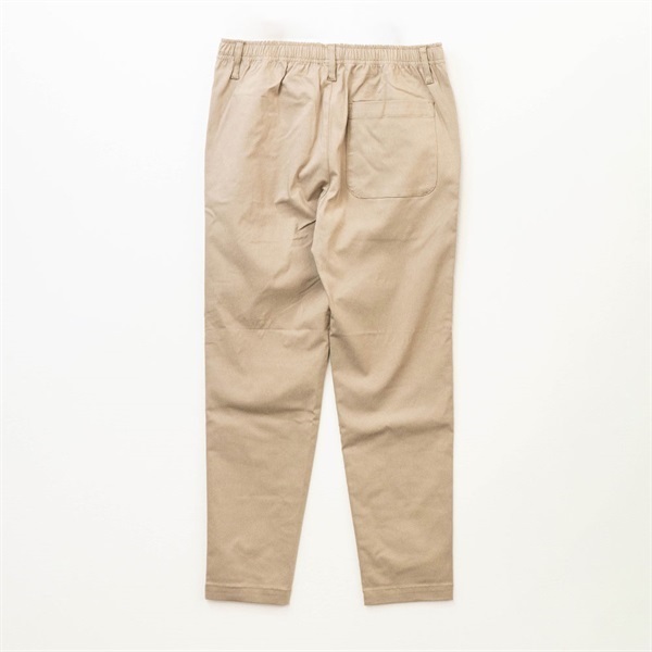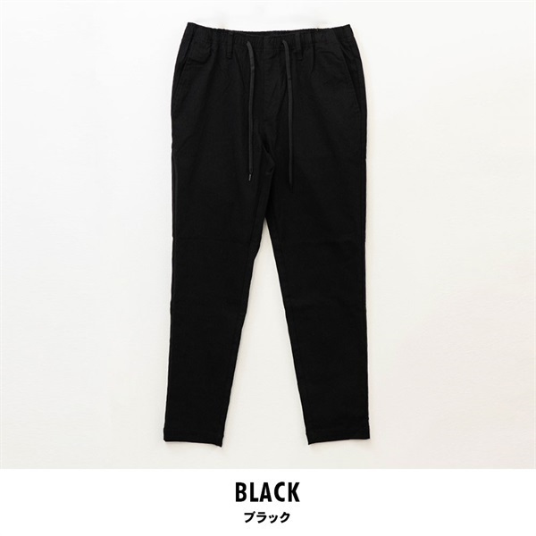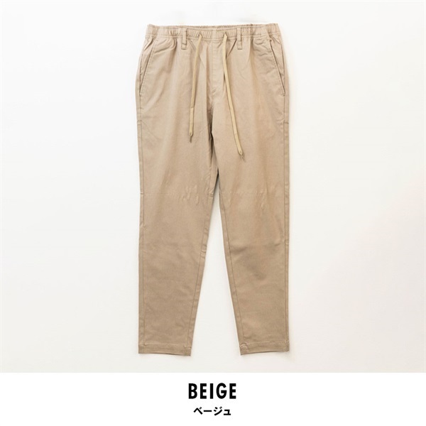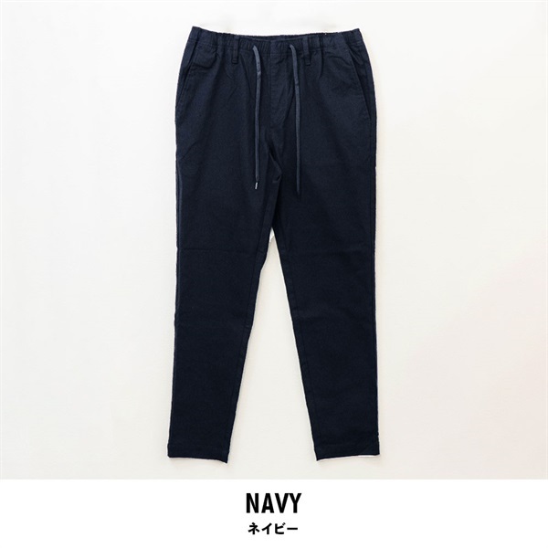 ウエストはゴムシャーリング、ヒモ、ベルトループ付き。シルエットは裾に向かって細くなるテーパードデザイン。ウエストのヒモは内側でも外型でも結べる2WAYスタイル。毛玉になりにくくアイロンがけが簡単なのも嬉しいポイント。