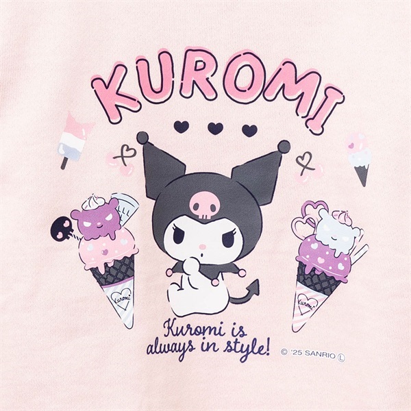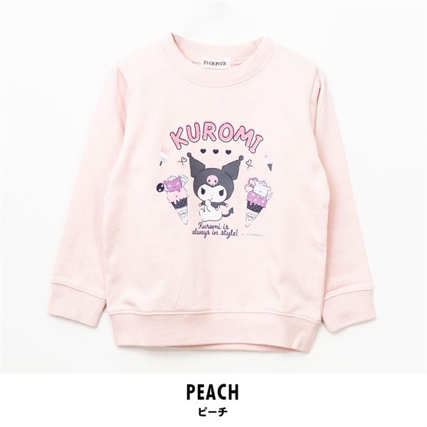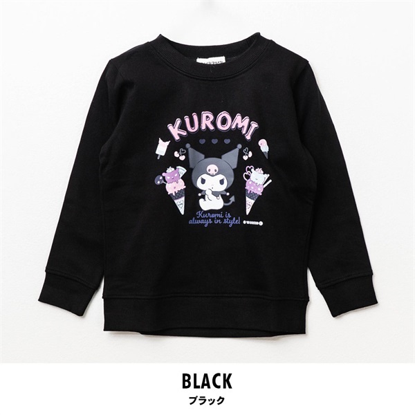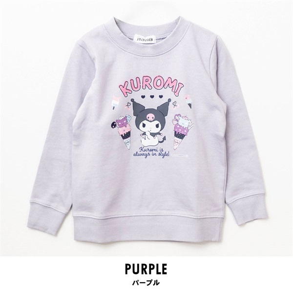 フロントにはアイスクリームと一緒にポップに描かれたクロミのプリント入りで、遊び心のあるかわいいデザインに仕上げています。生地は裏毛仕様で柔らかく、ロングシーズン快適に着られる一枚。袖口や裾はリブ仕立てで動きやすく、普段着やお出かけにも活躍します。カラーは選べる ピンク・ブラック・パープル の3色展開。クロミ好きのお子さまにぴったりな、毎日着たくなるスウェットシャツです。