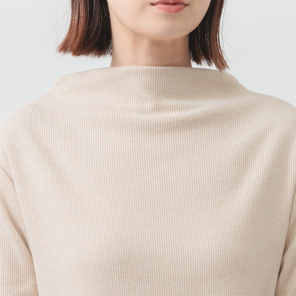 身頃はふんわりと起毛したやさしい杢カラーのリブ素材を使用し、肌あたりも柔らかく快適な着心地。 シンプルながら一枚でサマになるバランスの良さが魅力です。