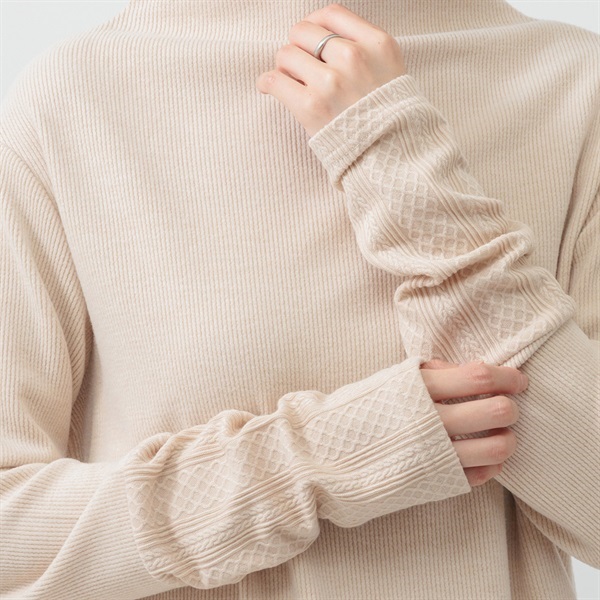 すっきりと見えるボトルネックに、表情豊かなジャガード袖を切り替えたデザインが冬のコーデに季節感と華やかさをプラス