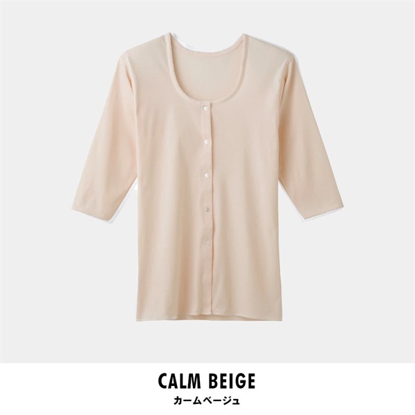 やわらかな綿100%素材で肌にやさしく、毎日着たくなる定番の七分袖前開きシャツ